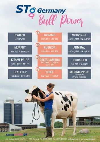 STG Germany Bull PowerDie April-Zuchtwertschätzung hat uns ein breites Top-Bullenangebot beschert. Grund genug, um einige dieser Bullen in unserer neuen STG Germany Bull Power Anzeige zu bewerben.